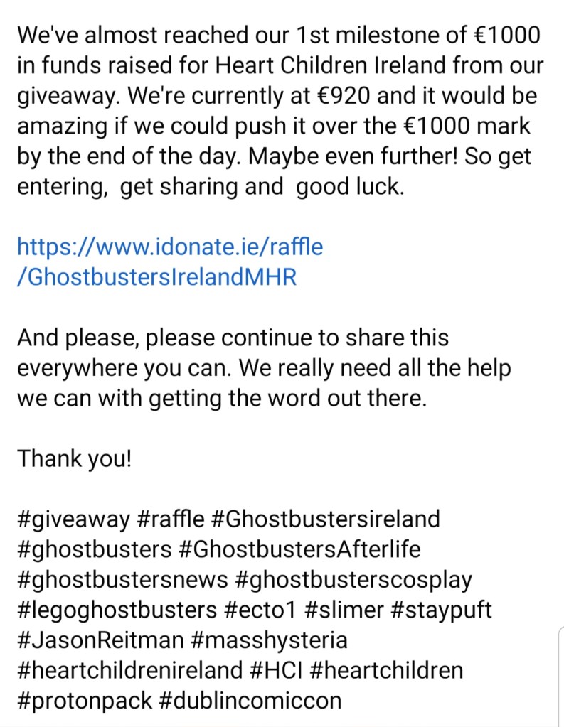 PLEASE DON’T IGNORE THIS. IT COULD BE YOUR CHILD OR SOMEONE YOU KNOW. The amazing folks at Ghostbusters Ireland need your help to raise over £1000 for Heart Children Ireland. It’s Easter Mmonday so any change you have please buy a ticket for the raffle to win the goodies below.