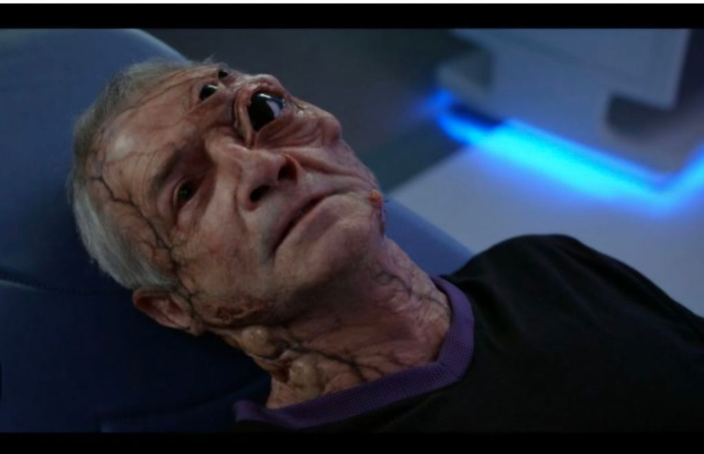 Returning to The Orville, they are examining the data they have collected when Christie begins convulsing badly and his face begins to change. Returning to the station they discover the jellyfish flower actually spat spores into Christie’s face and began rewriting his DNA into one of the creatures. Claire begins working on a cure but before long Christie has fully morphed into a spider like alien with eight eyes and fangs. it seems the Krill legends are all too true. He then uses his command codes to disable The Orville and plunges the ship into darkness.
