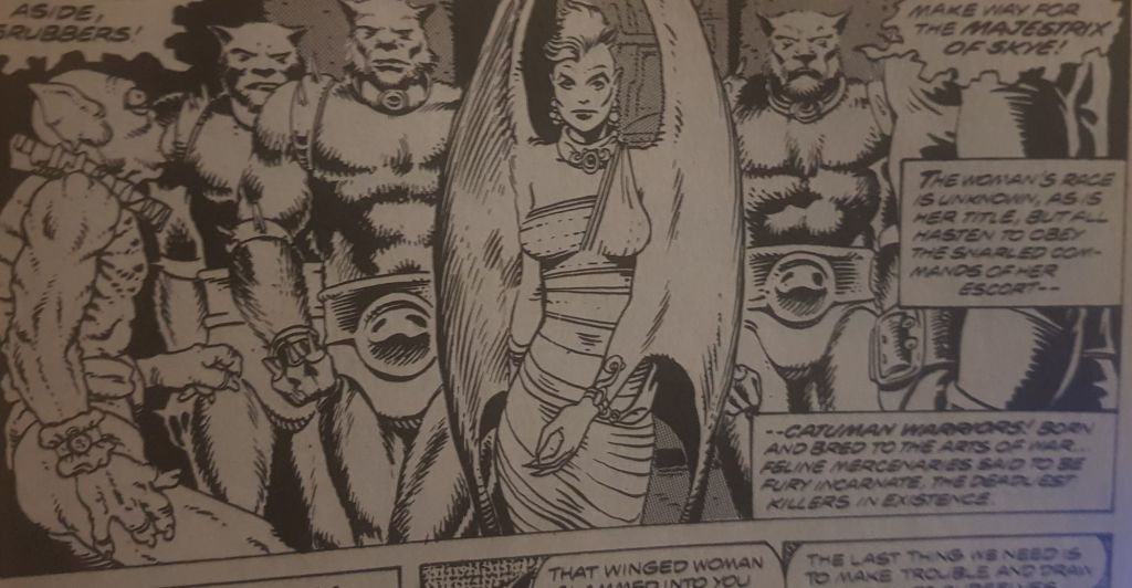 Our heroes respite is short lived when Han takes them to the planet Tirahnn with its exotic marketplaces. Recognised as rebels, Luke and Leia are set up and accused of being thieves by Kharya, the Majestrix of Skye. She slams into Leia deliberately and she sets her bodyguards, the Catuman on them. Luke is injured but Han and wookie Chewbacca arrive and rescue them.