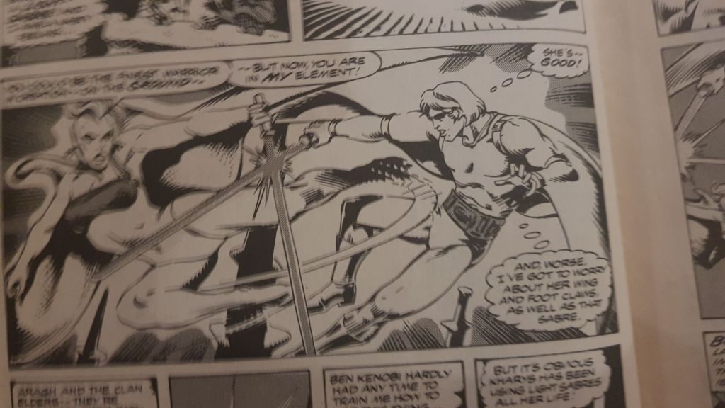 Suddenly Leia and Luke are leading an attack on Kharys’ fortress to save their friends. The reader gets no explanation at their sudden freedom but the answer may lie with Luke’s lightsaber. Using glider wings they manage to hit the Imperials hard. They found Skye and quickly took control as part of the Empire. Kharys used this opportunity to lure Han to Skye once she recognised Leia from wanted posters in the marketplace. She knows Luke destroyed the Death Star so by logic she knows of the involvement of a certain Corellian freighter. It also reminds us Leia is no pushover as she fights two Catuman warriors ending on a cliffhanger.